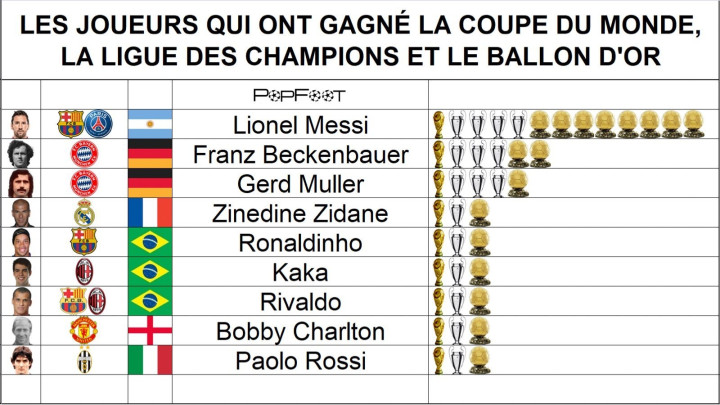 直播吧01月29日讯海外数据博主晒图统计了取得过宇宙杯+欧冠+金球奖的球员,其中梅西1宇宙杯4欧冠8金球最多。