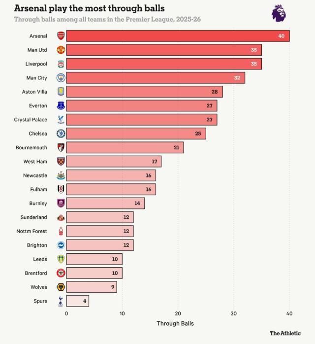 竞技网提供的一组更微不雅的数据简略能够讲明一些问题:在直传球方面,阿森纳是开季以来的英超“冠军”,统共送出40次直传,紧随后来的是曼联和利物浦(各35次),这一榜单垫底的是枪手的北伦敦死敌热刺,唯有4次!