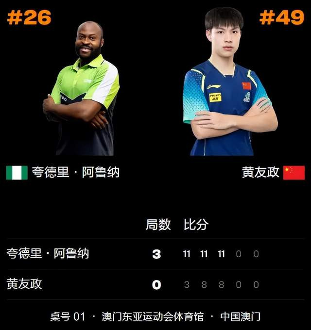 比赛首局,阿鲁纳赶紧插足情状,凭借强势的正手蹙迫和踏实的推崇以11-3先下一城。第二局黄友政虽尝试支援政策,一度与敌手缠斗至4-4平,但在中局阶段未能握续施压,以8-11再失一局。第三局两边比分轮流飞腾,黄友政在6-9逾期时曾追至8-9,但最终仍以8-11告负。