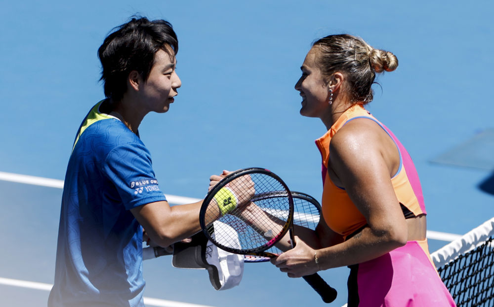 1月21日,中国选手白卓璇(左)与白俄罗斯选手萨巴伦卡赛后抓手请安。新华社记者 马平 摄
