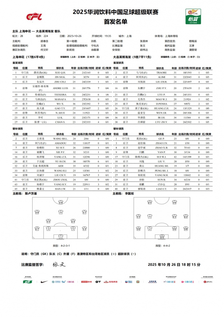 10月26日讯 北京时代19点35分,中超第28轮,上海申花主场迎战大连英博,赛前两边公布首发。