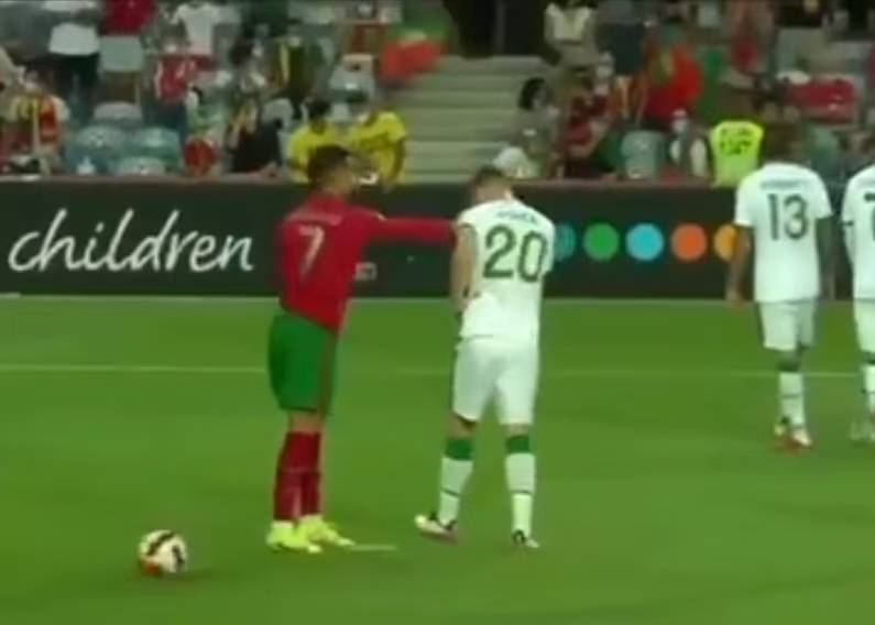 比赛中出现了争议一幕:C罗因向爱尔兰球员达拉-奥谢挥肘,经VAR回放后被主裁直红罚下。