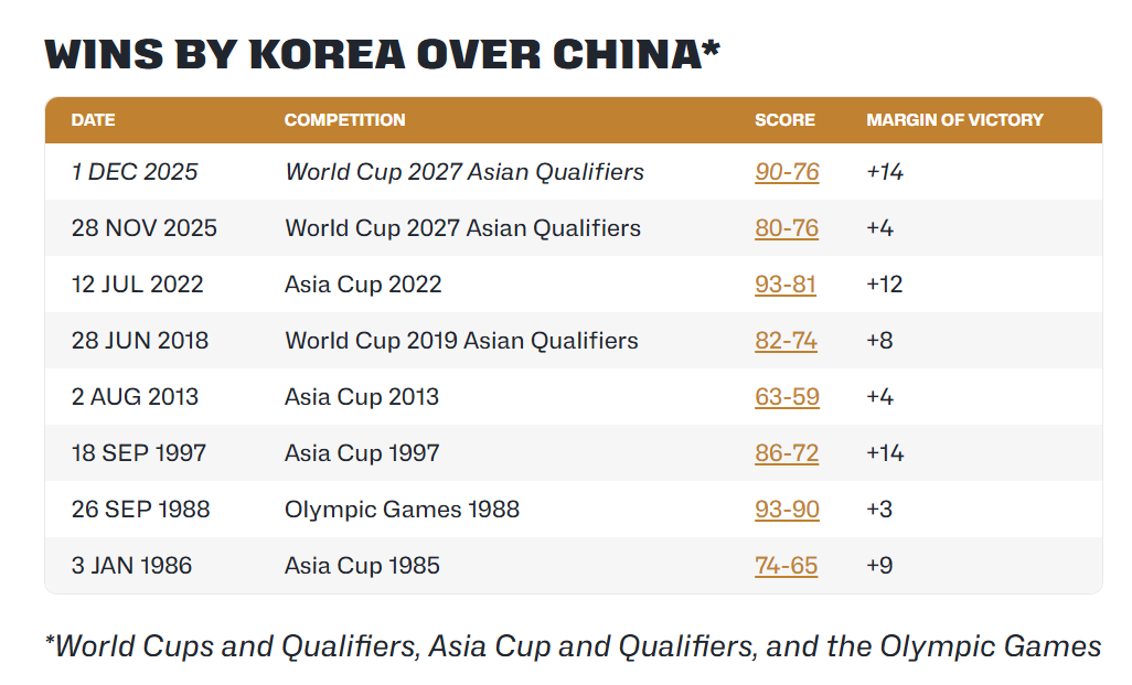 事实上,中国队前不久刚赢过韩国队。本年亚洲杯四分之一决赛中,中国队以79:71打败敌手,时隔10年再度打入亚洲杯四强。