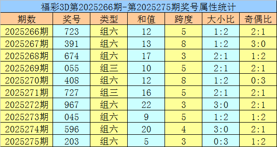 开奖转头:福彩3D第2025275期开出奖号203。奖号阵势为组六,奇偶比为1:2体育最新信息,012路比为2:0:1,大小比为0:3,和值为5,跨度为3。