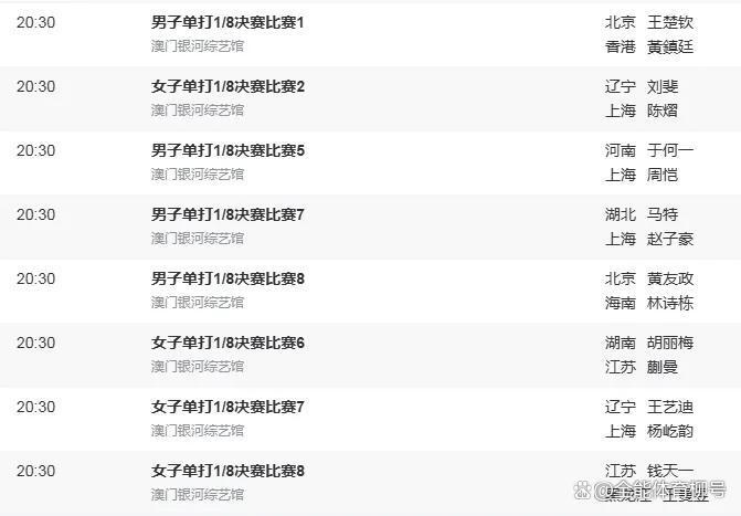 其中,男人单打4场,女子单打4场。男人单打1/8决赛,代表北京队出战的寰宇第一王楚钦,迎战中国香港队的黄镇廷。代表海南出战的寰宇第二林诗栋,迎战相同庚青的北京选手黄友政。河南队于何一双阵上海队的周恺,湖北的马特对阵上海队的赵子豪。